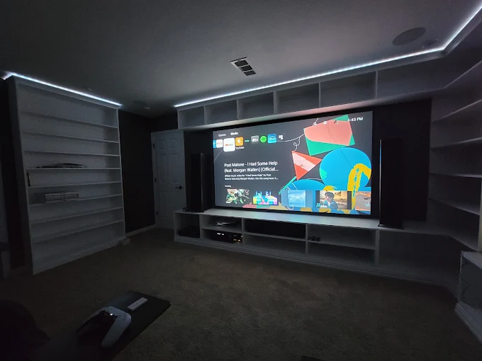 A professional home theater installation includes TV mounting, speaker placement, soundbar setup, Apple TV configuration, and organized cable management to create a comfortable and immersive entertainment experience.